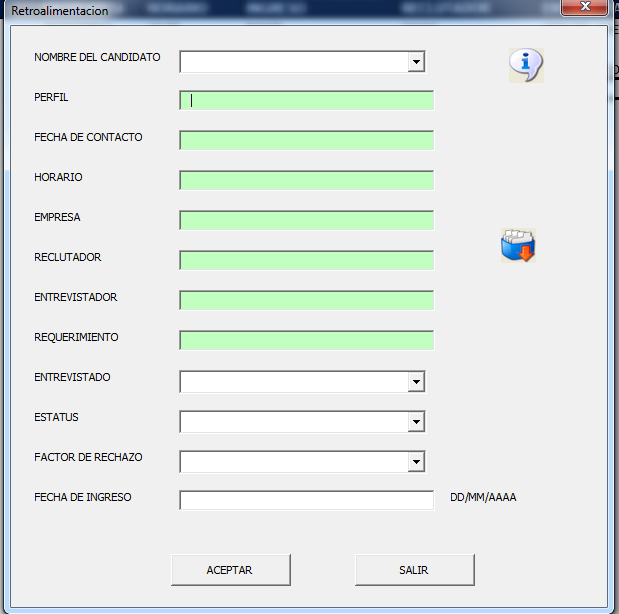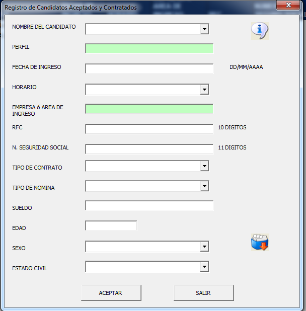 Descripción: Con este control, podrá llevar el control de todos sus candidatos, dar de alta candidatos aceptados como empleados, dar de alta reclutadores, así como llevar una estadística de factores de rechazo y reportes diversos que le aportaran la mayor información relevante, ya que el motor es una macro, con la cual tendrá velocidad en realizar reportes y validaciones en la captura de datos evitando tener errores.
